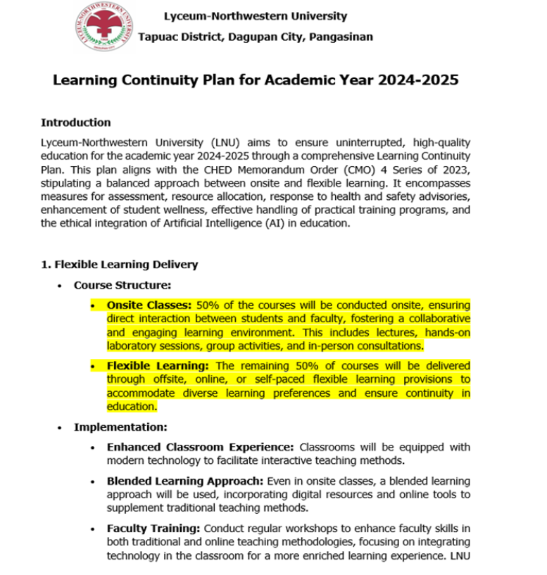 In support of this flexible workforce model, most academic programs at L-NU are delivered through a hybrid learning approach—50% face-to-face and 50% online. This structure lessens campus congestion, decreases transportation demand, and optimizes the use of institutional resources, while still preserving the essential value of in-person academic engagement. Through digital platforms, virtual consultations, and blended instructional strategies, L-NU ensures uninterrupted access to education without relying solely on traditional classroom attendance.