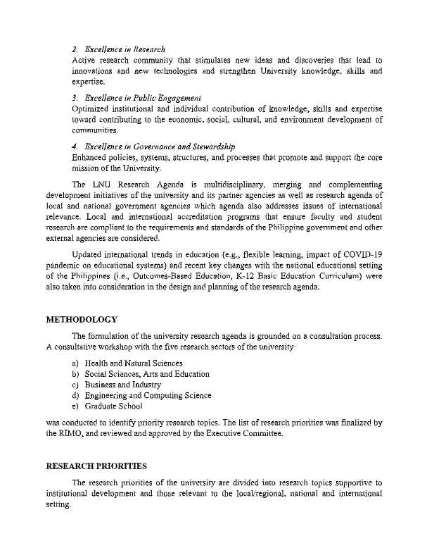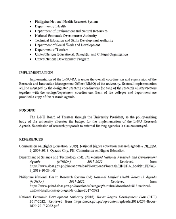 The university’s commitment to policy-relevant and government-engaged research is clearly articulated in the L-NU University Research Agenda, which prioritizes studies aligned with governance, public health, education, climate resilience, community development, and other national and regional priorities. This agenda guides faculty and student researchers to engage with government agencies and produce outputs that can inform public policies and improve service delivery.