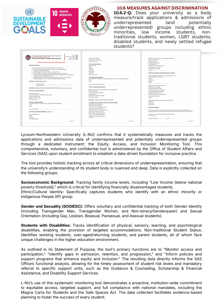 Lyceum-Northwestern University (L-NU) confirms that it systematically measures and tracks theapplications and admissions data of underrepresented and potentially underrepresented groups through a dedicated instrument: the Equity, Access, and Inclusion Monitoring Tool.
