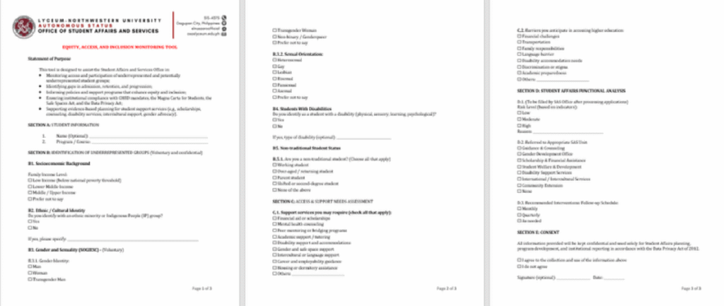 Lyceum-Northwestern University (L-NU) confirms that it systematically measures and tracks theapplications and admissions data of underrepresented and potentially underrepresented groups through a dedicated instrument: the Equity, Access, and Inclusion Monitoring Tool.