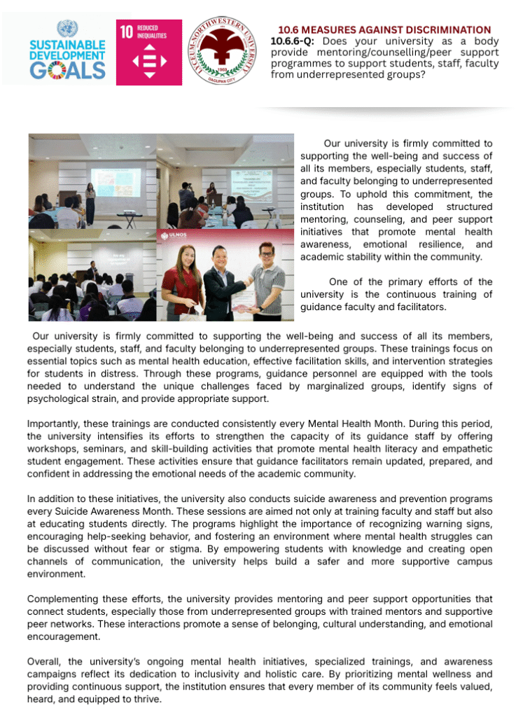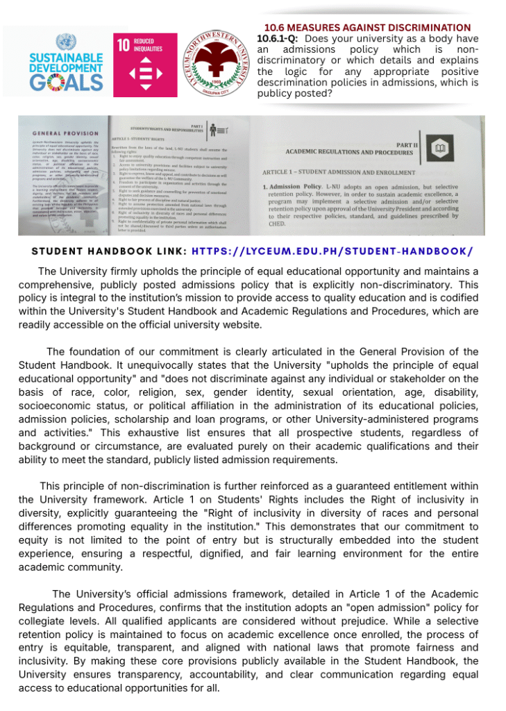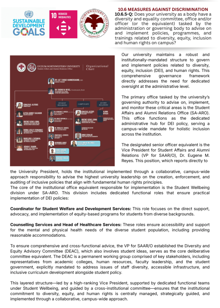 The Sustainable Development Goals (SDGs) at Lyceum-Northwestern University (LNU) refer to the institution’s commitment to advancing global sustainability through education, research, and community engagement. LNU actively supports the United Nations’ 17 SDGs, which aim to tackle pressing global challenges such as poverty, inequality, climate change, environmental degradation, peace, and justice. Through various academic programs, initiatives, and partnerships, the university fosters awareness, innovation, and collaboration, encouraging students and stakeholders to contribute to achieving these goals for a more sustainable future.